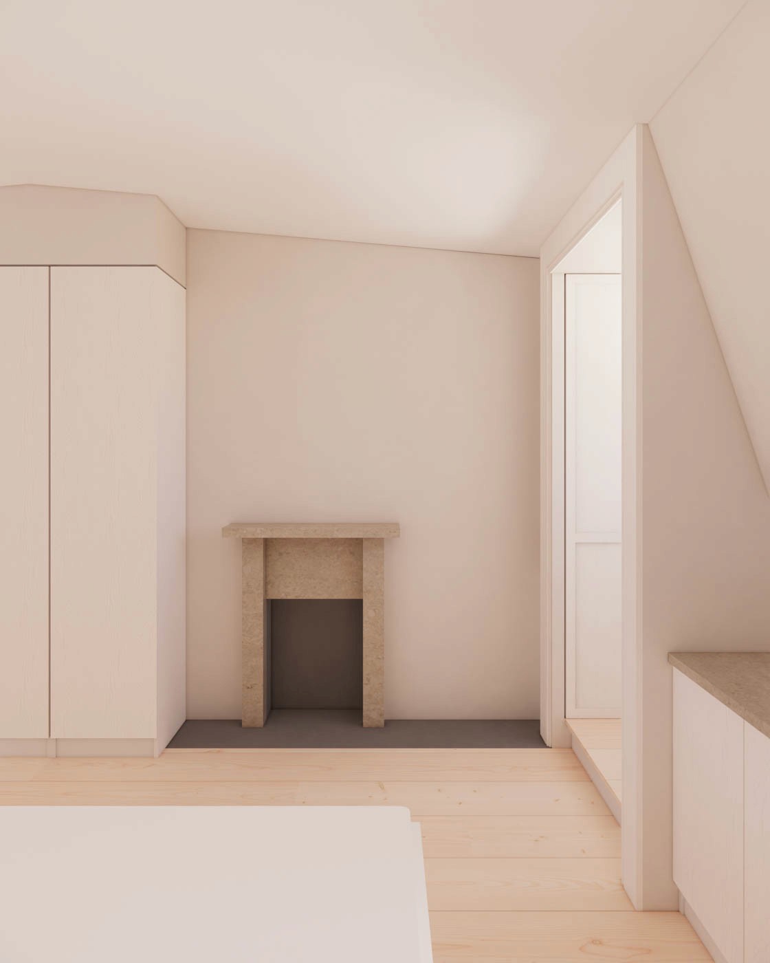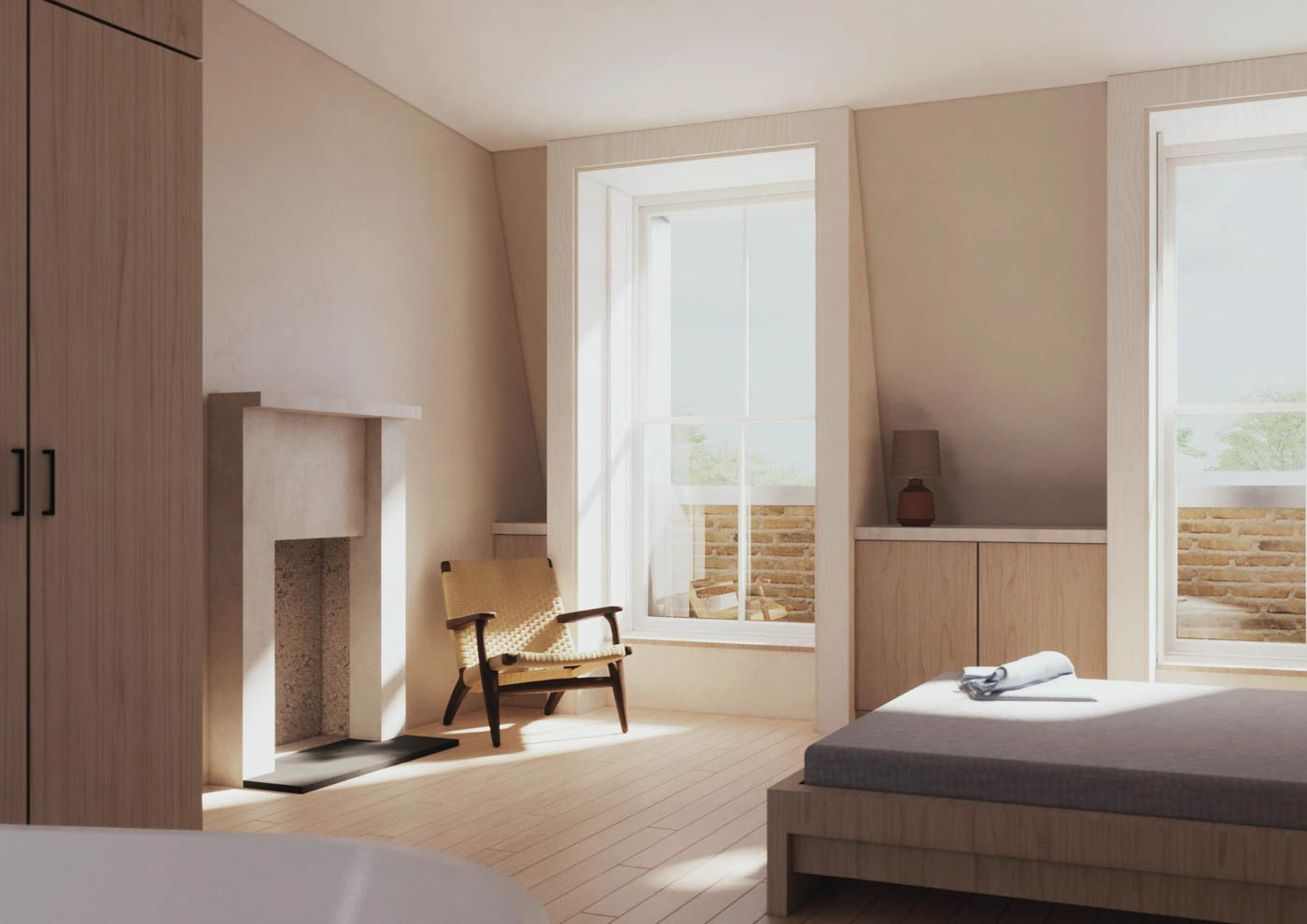 Behind a large pocket door, the new staircase leads to a level that feels private and tranquil, entirely separate from the house below. The bedroom spans the full footprint of the main house, offering front-to-back views through generous windows. Sculptural elements subtly soften the room, and earthy tones and timber textures in the flooring and cabinetry introduce natural warmth. Period-inspired details, like a new fireplace and large sash windows, anchor the addition within its historic context.