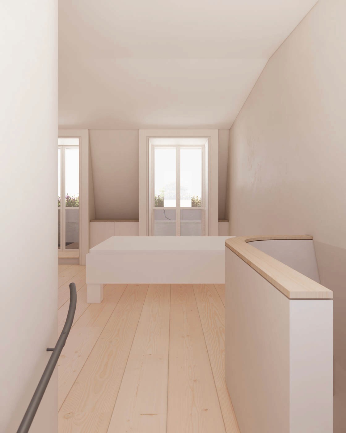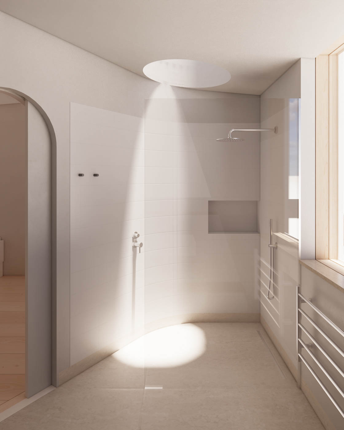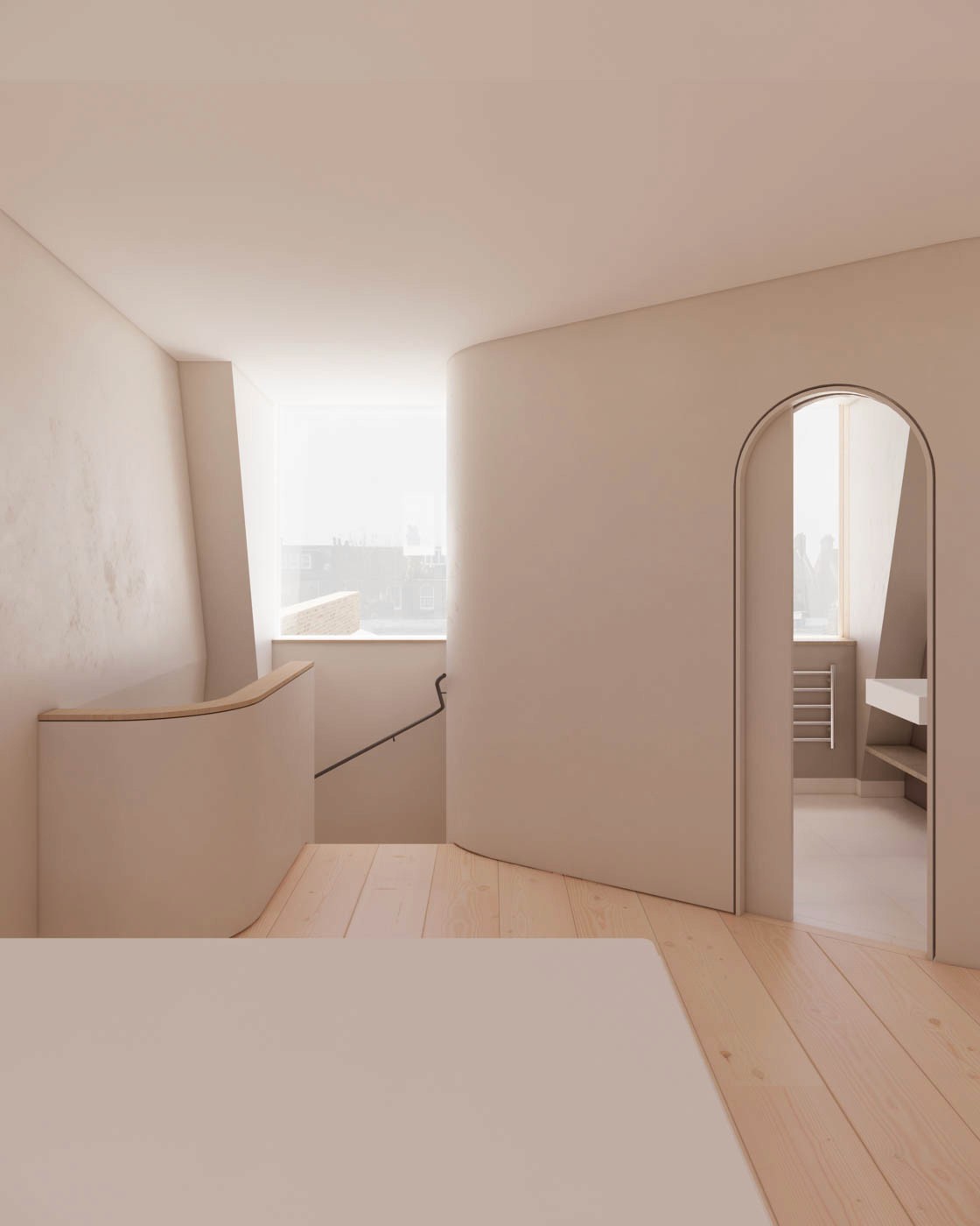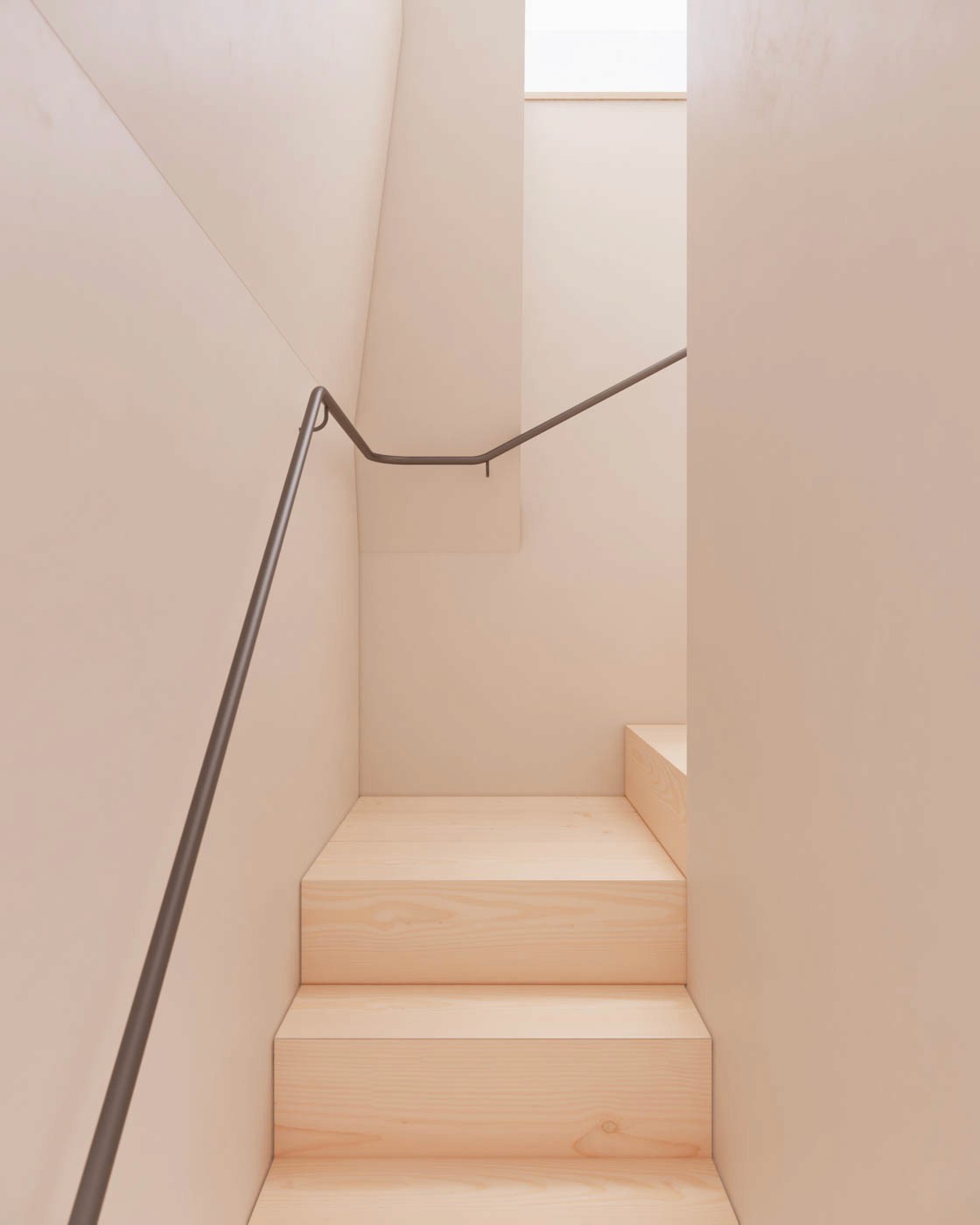 Positioning the bedroom door at the bottom of the stair, rather than the top, allows the space to unfold as a single, continuous volume. The bathroom is defined by a sculpted wall that doesn’t intrude in the space, while a circular skylight above the shower follows the curve of the wall, bringing light into the space.