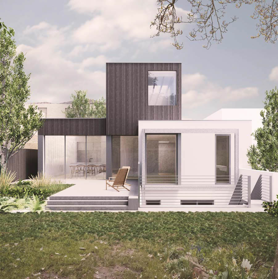 Extensive additions to a family home, creating improved living accommodation and dedicated work-from-home space. The original house, built in the early 2000s, had compact living areas and subterranean bedrooms. The proposal added a ground-floor extension and a new upper volume, successfully gaining planning permission on a sensitive site.